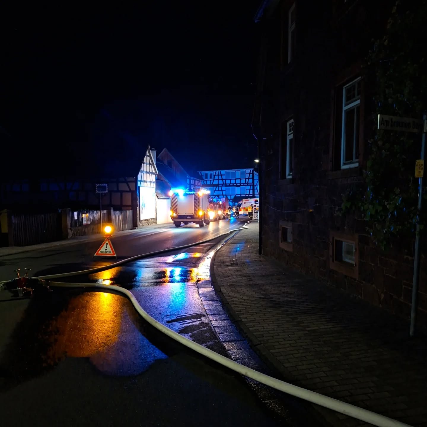 Ein nächtlicher Garagenbrand in Himbach hat am späten Freitagabend, den 24.04.2026, zu einem großangelegten Feuerwehreinsatz geführt. Gegen 22:59 Uhr alarmierte die Leitstelle die Einsatzkräfte mit dem Stichwort „Garagenbrand“. Bereits während der Anfahrt in Richtung des Ortsendes nach Eckartshausen konnten die Wehrleute einen deutlichen Feuerschein und starken Rauch wahrnehmen. Vor Ort bestätigte sich die dramatische Lage: Ein hölzerner Unterstand direkt an einer Garage stand in voller Ausdehnung in Flammen. Das Feuer hatte bereits auf eine benachbarte Hecke übergegriffen und drohte, die angrenzende Wohnbebauung zu erfassen.