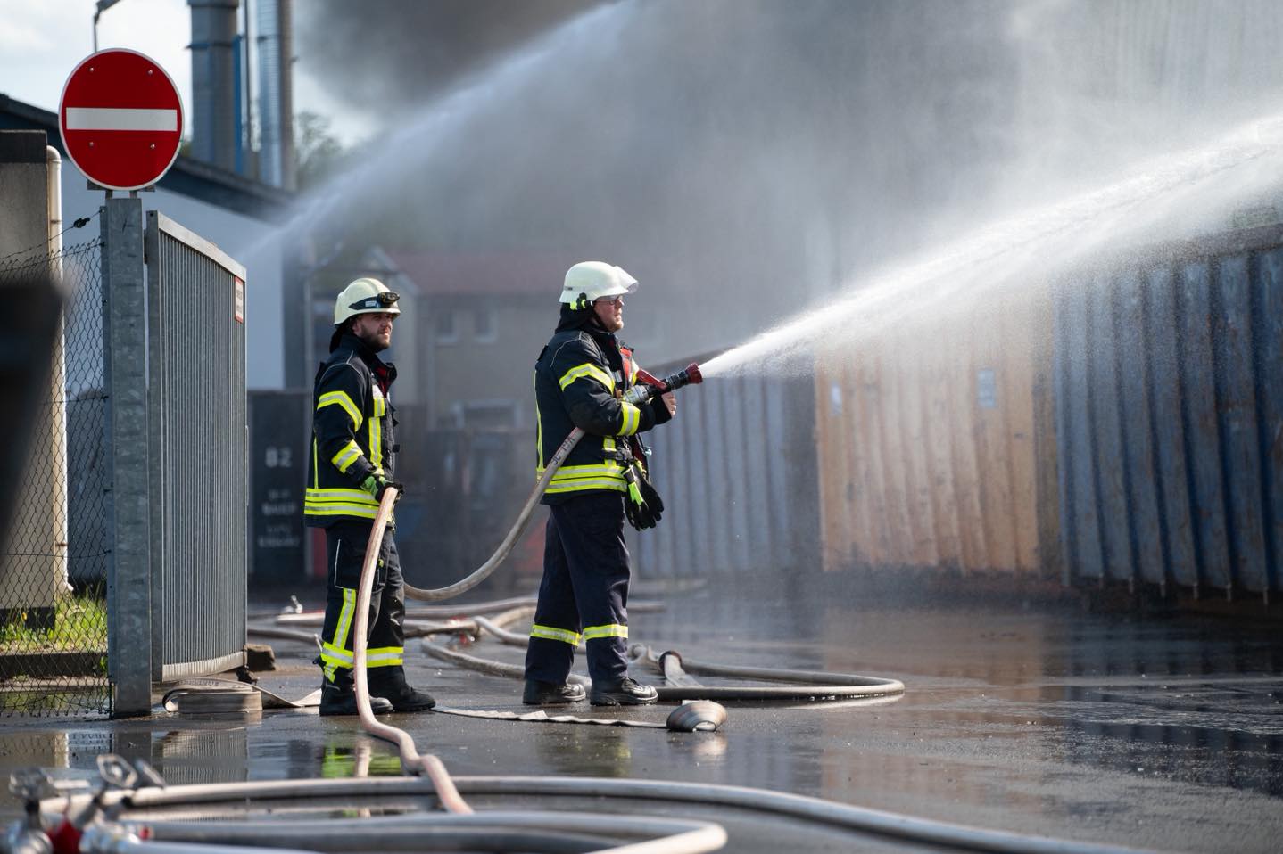 Die Situation vor Ort war für die rund 140 Einsatzkräfte, darunter auch die Werkfeuerwehr von Daimler Germersheim, hochgradig kritisch. In der brennenden Halle befanden sich mehrere Druckgasbehälter, die von den Atemschutztrupps jedoch rechtzeitig geborgen und gekühlt werden konnten. Besondere Sorge galt zudem einem Diesel-Tank mit rund 5.000 Litern Treibstoff unter der Halle. Dank einer gezielten Riegelstellung gelang es den Wehren, ein Übergreifen der Flammen auf den Tank und angrenzende Hallenkomplexe zu verhindern.
