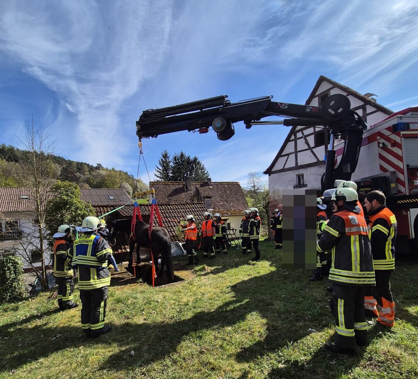 Für die eigentliche Bergung kam schwere Technik zum Einsatz. Der Kran des Rüstwagens aus Waldaschaff wurde in Position gebracht, während die Einsatzkräfte spezielles Hebegeschirr für Großtiere unter dem Bauch des Pferdes fixierten. Mit Fingerspitzengefühl wurde das Tier schließlich kontrolliert und schonend aus der Grube gehoben.