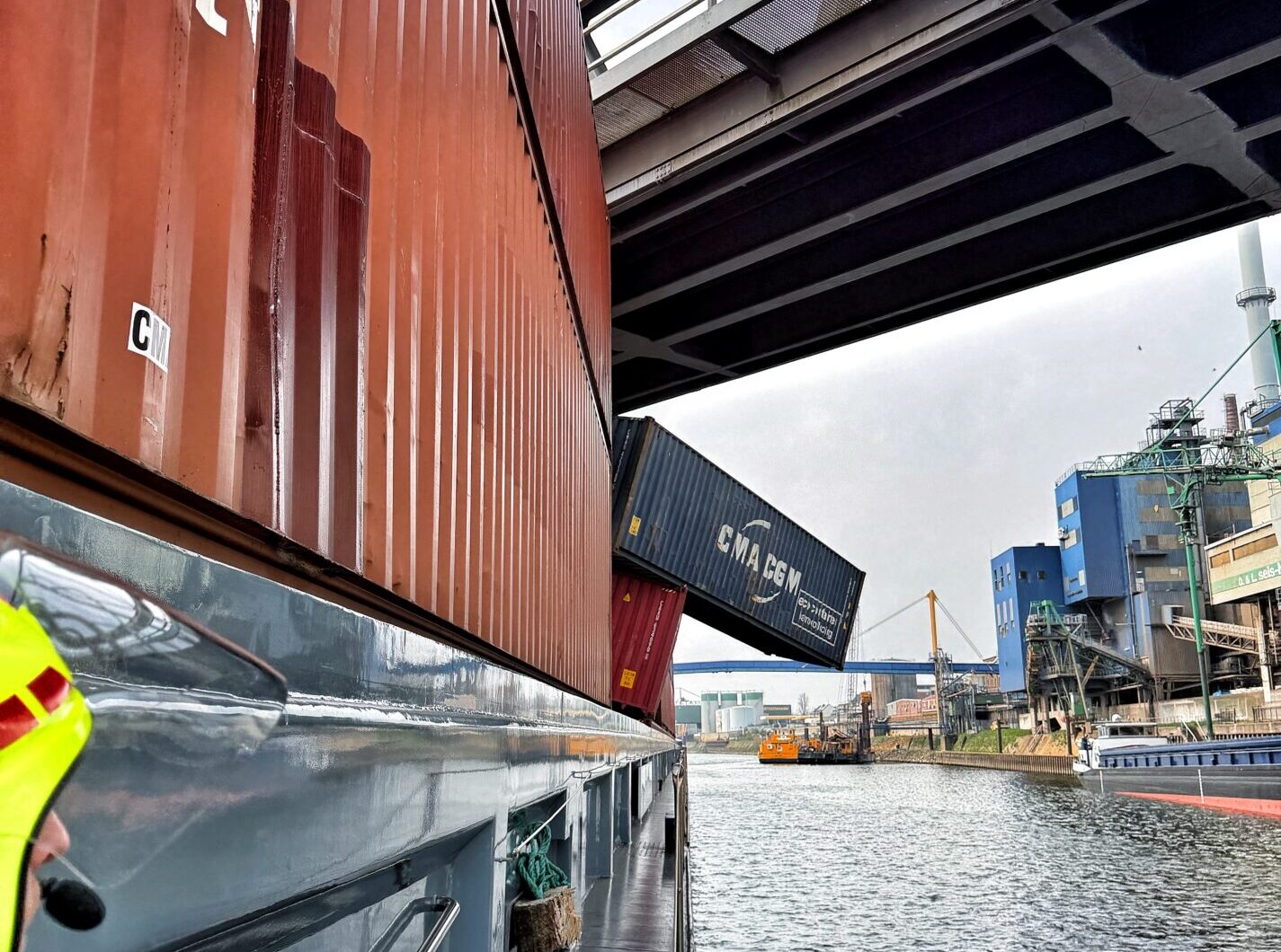 Beim Eintreffen der ersten Einsatzkräfte der Feuerwehr Neuss bot sich eine komplexe Lage. Weitere Container drohten vom Deck zu rutschen, da sie sich teilweise zwischen dem Schiff und der Brückenkonstruktion verkeilt hatten. Um eine unkontrollierte Gefahr abzuwenden, entschieden die Verantwortlichen in enger Abstimmung, die Hubbrücke kontrolliert anzuheben.