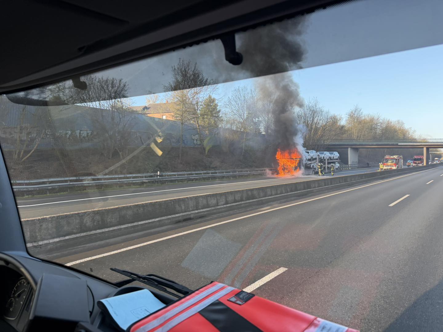Ein spektakulärer LKW-Brand auf der A30 bei Löhne hat am Donnerstag, den 26.03.2026, zu erheblichen Verkehrsbehinderungen und einem massiven Feuerwehreinsatz geführt. Gegen 07:07 Uhr wurden die Einsatzkräfte der Löhner Feuerwehr auf die Autobahn alarmiert. Bereits während der Anfahrt wies eine weithin sichtbare, tiefschwarze Rauchsäule den Weg zur Einsatzstelle. Aufgrund der massiven Rauchentwicklung wurden unmittelbar weitere Einheiten zur Unterstützung angefordert. Beim Eintreffen der ersten Kräfte der Hauptamtlichen Wache sowie der Löschgruppen Mennighüffen und Ort bot sich ein dramatisches Bild: Eine Sattelzugmaschine stand bereits lichterloh in Flammen. Die Hitze war so intensiv, dass das Feuer bereits auf die geladenen Neufahrzeuge, mehrere Porsche Macan, des Autotransporters übergegriffen hatte.