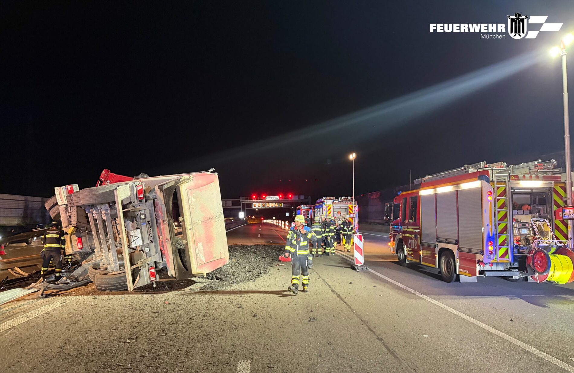 Ein heftiger LKW-Unfall auf der A99 hat am späten Freitagabend, den 24.04.2026, zu einer stundenlangen Vollsperrung der Autobahn geführt. Gegen 22:24 Uhr war der Fahrer eines Kipplasters im Bereich zwischen den Tunneln Aubing und Allach unterwegs, wo derzeit der Fahrbahnbelag erneuert wird. Mutmaßlich aufgrund überhöhter Geschwindigkeit kollidierte das schwere Baustellenfahrzeug zunächst mit einem Haufen abgefrästen Asphalts, geriet ins Schlingern und durchbrach schließlich die Mittelleitplanke. Das Fahrzeug stürzte auf die Seite, wobei die Fahrerkabine gefährlich über der zerstörten Leitplanke hing.