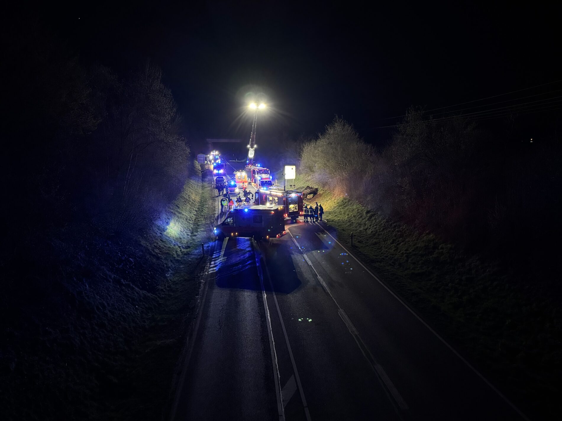 Ein schwerer Unfall auf der L288 bei Westerburg hat am Freitagabend, den 27.03.2026, zu einem großangelegten Rettungseinsatz geführt. Gegen 20:27 Uhr wurden die Feuerwehren aus Westerburg, Gershasen und Wengenroth mit dem Stichwort „Eingeklemmte Person“ alarmiert. An der Einsatzstelle im Bereich der Abfahrt Wengenroth bot sich den Rettern ein Trümmerfeld: Einer der beteiligten Pkw lag auf dem Dach in einem Straßengraben, während das zweite Fahrzeug schwer beschädigt auf der Fahrbahn zum Stehen gekommen war.