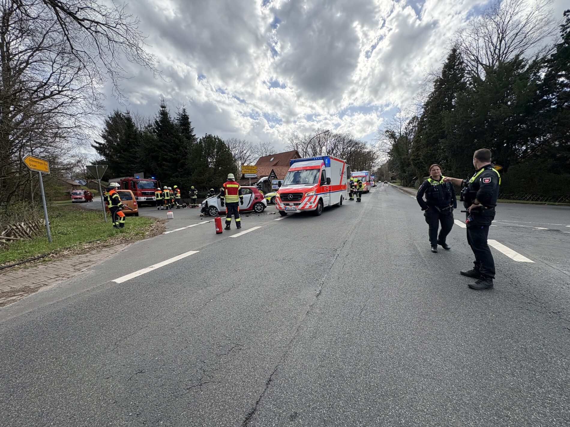 Ein folgenschwerer Unfall in Hemslingen an der Kreuzung Schneverdinger Straße / Scheeßeler Straße hat am Ostersonntag, den 05.04.2026, zu einem größeren Rettungseinsatz geführt. Gegen 15:30 Uhr kollidierten zwei Fahrzeuge im dortigen Kreuzungsbereich massiv miteinander. Nach ersten Erkenntnissen der Polizei beabsichtigte eine Autofahrerin aus der Gemeinde Scheeßel mit ihrem Volkswagen die Kreuzung zu überqueren, übersah dabei jedoch einen vorfahrtberechtigten Smart, der aus Richtung Bremen kam. Durch die Wucht des Aufpralls wurde der Smart im Front- und Seitenbereich erheblich beschädigt. Während die beiden Fahrzeugführer den Zusammenstoß glücklicherweise unverletzt überstanden, erlitt die Beifahrerin im Smart schwere Verletzungen.